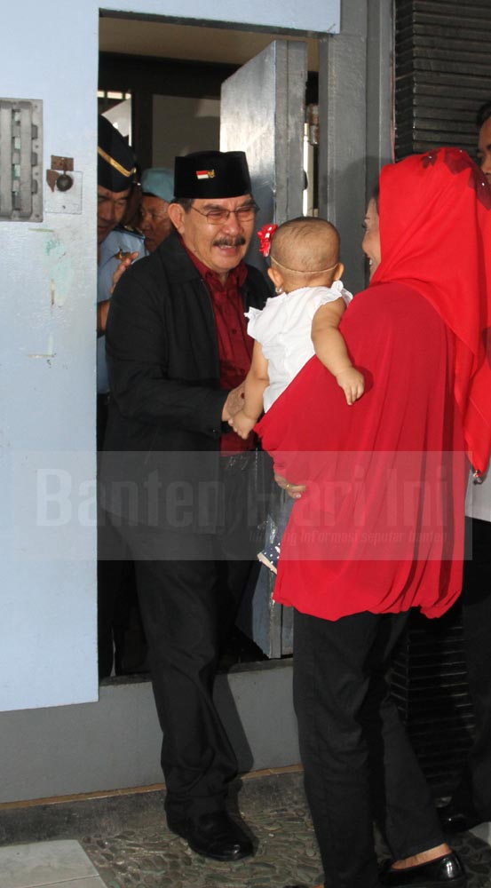 bantenhariini, Tangerang – Mantan Ketua Komisi Pemberantasan Korupsi (KPK) Antasari Azhar akhirnya bebas dari masa tahanan di Lapas Kelas I Dewasa Tangerang, Jalan Veteran, Kota Tangerang, Kamis (10/10/). Saat keluar sekira pukul 10.00 WIB, Antasari sudah disambut puluhan orang, yakni keluarga, pengacara serta mahasiswa. Antasari yang mengenakan kemeja hitam yang dibalut jas hitam dan kopiah ini langsung mendekati keluarganya. Dia memeluk istri, anak dan cucunya yang sudah sabar menunggu kebebasannya selama 7,5 tahun.