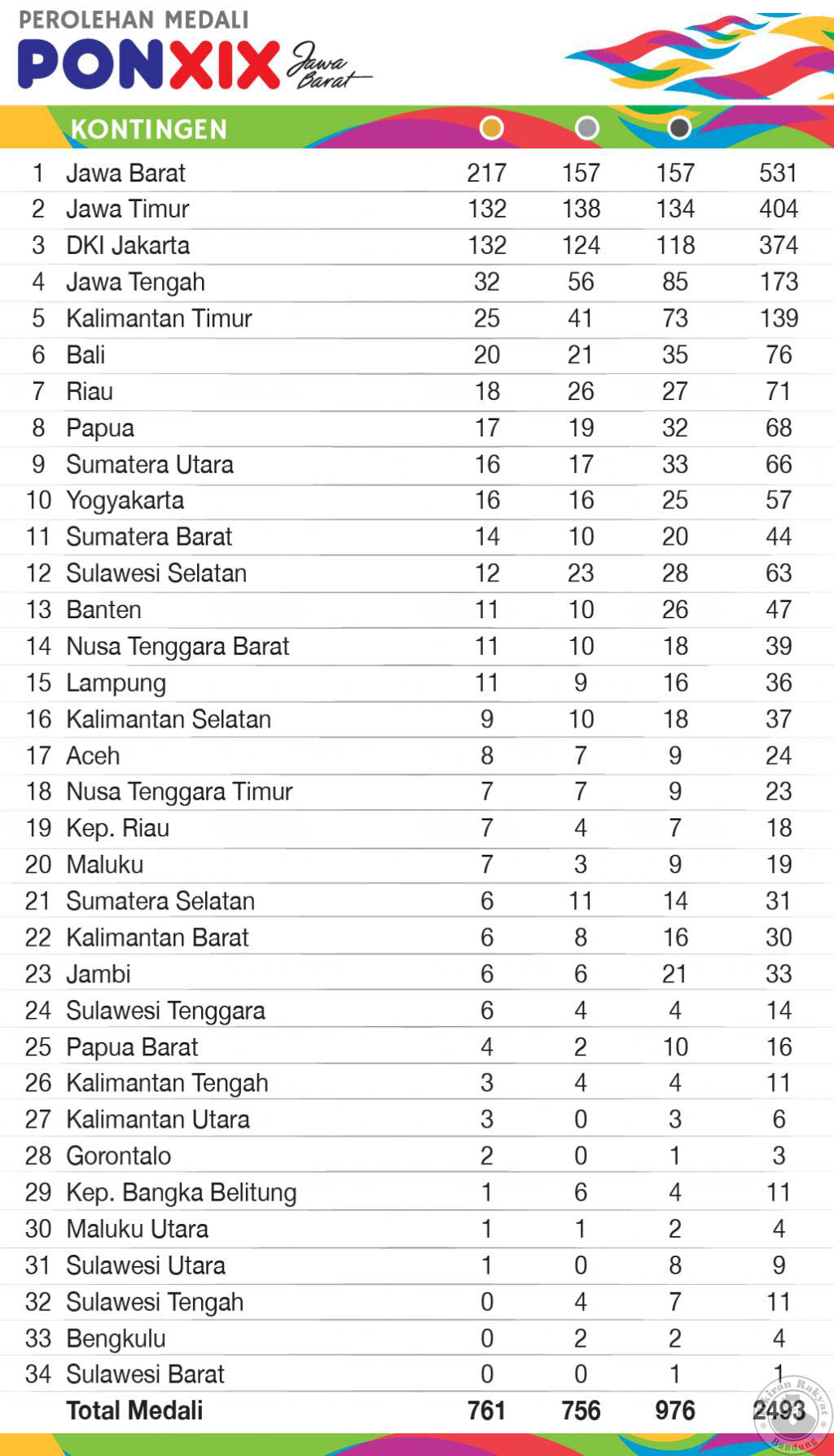 Sampai pertandingan terakhir, kontingen Jabar mengumpulkan medali terbanyak dengan 217 emas, 157 perak, dan 157 perunggu. Jumlah seluruhnya 531 medali. Medali emas terakhir disumbangkan oleh cabor sepakbola.
