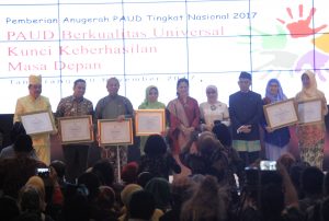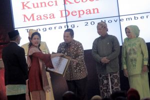 TANGERANG, bantenhariinii.com – Wali Kota Tangerang H. Arief R. Wismansyah dan istrinya, Aini Suci Wismansyah sebagai Bunda PAUD menerima penghargaan atas kinerja dan kepeduliannya mendukung gerakan nasional PAUD berkualitas dalam rangka Anugerah PAUD Tingkat Nasional Tahun 2017. Penghargaan tersebut diserahkan langsung oleh Ibu Negara Republik Indonesia yang juga Bunda PAUD Nasional Iriana Joko Widodo. Ibu Negara memberikan langsung penghargaan tersebut didampingi oleh Menteri Pendidikan dan Kebudayaan Prof. Dr. Muhadjir Effendy di Hotel Allium, Jalan Benteng Betawi, Tangerang, Senin (20/11).