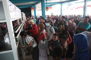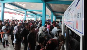 MERAK, bantenhariini.com – Memasuki hari ke dua Idul Fitri, ribuan penumpang dari Pulau Jawa ke Sumatera masih terlihat di Pelabuhan Merak, Kota Cilegon, Sabtu (16/6). Sejak pagi, mereka rela mengantre untuk mendapat tiket akses memasuki kapal penyeberangan. Panjangnya antrean terlihat hingga ke area parkir pelabuhan dan diperparah dengan berkurangnya loket pelayanan yang dibuka. “Setelah antre setengah jam baru dapat tiket,” ujar Agus, pemudik dari Kota Tangerang.