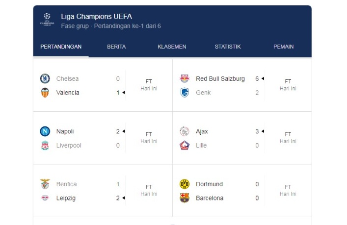 Berikut daftar lengkap hasil penyisihan Liga Champions pada Selasa dan Rabu 17-18 September 2019.