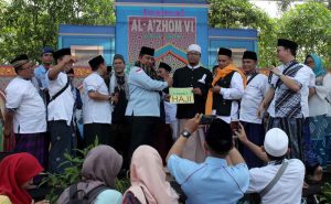 TANGERANG, bantenhariini.com – Eri Mustari, warga Poris Plawad Kecamatan Cipondoh, memenangkan undian tiket paket berangkat Ibadah Haji, saat Jalan Sehat Sarungan, di Masjid Al-Azhom, Kota Tangerang, Minggu (1/9). Pria berusia 44 tahun tersebut berhak menjadi pemenang setelah nomor kuponnya 4222, keluar saat diundi paniitia.
