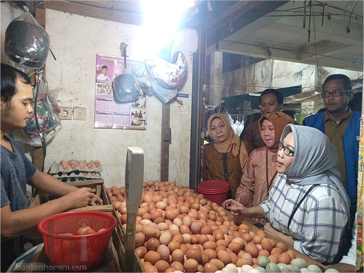 SERANG, bantenhariini.com – Inspektur Jenderal (Irjen) Kementrian Perdagangan (Kemendag) RI, Srie Agustina bersama Kepala dinas Disperindag Provinsi Banten, Babar Suharso dan perwakilan bulog melakukan pemantauan dan perkembangan pasokan harga kebutuhan pokok di pasar Rau Kota Serang, Selasa (11/12/2018).