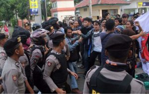 Bentrok mahasiswa dan aparat terjadi ketika mahasiswa berupaya menutup jalan pada pukul 17.45 WIB. Saat itu aparat membubarkan paksa. Di saat kisruh itu, Panji Romadon, salah satu wartawan Banten Pos diciduk anggota kepolisian. “Lagi mau ngambil foto, digebuk di belakang. Pas nengok langsung diteriakin provokator. Terus diinjak-injak dan dicekek. Trus dibawa ke mobil yang di DPMSTP Kota Serang,” kata Panji.