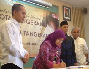 TANGERANG, bantenhariini.com – Komisi Pemilihan Umum Daerah (KPUD) Kota Tangerang menandatangani kesepakatan bersama dengan Rumah Sakit Umum Daerah (RSUD) Kabupaten Tangerang, Jumat (5/1).”Kesepakatan bersama dengan RSUD adalah yang pertama dilakukan selama empat tahun periode KPU. RSUD sebagai tempat pelaksanaan pemeriksaan kesehatan dalam Pilkada 2018,” kata Ketua KPU Kota Tangerang, Sanusi.
