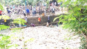 Sampah yan menumpuk itu berupa sampah kayu-kayu, steryofoam, plastik, bahkan kasur. Masyarakat membersihkannya dengan memanfaatkan perahu dengan saling mengoper sampah. Ada juga yang turun berenang mengumpulkan sampahnya. Lantas sampah yang ada di permukaan saluran setelah diangkat ke atas kemudian di masukan ke dalam karung.