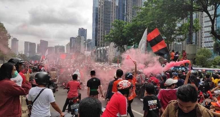 JAKARTA, bantenhariini.com – Ribuan pendukung The Jakmania Persija merayakan juara Liga 1 Indonesia dengan berpawai dari Gelor Bung Karno (GBK) menuju Balai Kota. Lalu lintas di Jalan Jenderal Sudirman pun padat karena dilewati oleh peserta pawai.