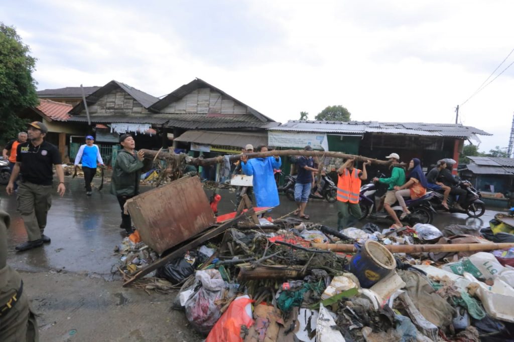 “Angkat sampahnya, mana mobil sampahnya bawa mendekat, hati-hati banyak pecahan kaca,” ujarnya sambil mengangkut sampah yang menutupi kali di dekat Kantor Kelurahan Petir.