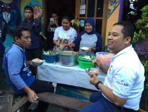 TANGERANG, bantenhariini.com – Walikota Tangerang Arief R Wismansyah sarapan di Kampung Bekelir saat menghadiri Peluncuran Pasar Kampung Bekelir, di RW 01, Kelurahan Babakan, Kota Tangerang, Minggu (11/2). Walikota datang sekira pukul 06.00 WIB, sebelum menghadiri kegiatan di Tugu Adipura. Kedatangan Walikota disambut warga yang sedang menyiapkan dagangan di teras rumahnya masing-masing. “Ayo sini kita sarapan bareng. Udah pada ganteng ama cantik tapi belum sarapan,” ujarnya menyapa warga.