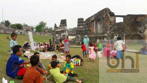 SERANG, bantenhariini.com – Sedikitnya 50 anak usia sekolah dasar menggelar aktivitas membaca di bekas reruntuhan Kraton Kaibon, Kecamatan Kasemen, Kota Serang. Kegiatan membaca di ruang terbuka tersebut sudah rutin mereka lakukan setiap hari Minggu.