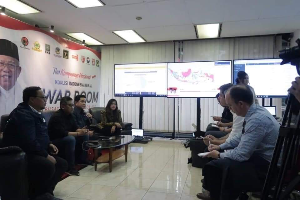 “Di sini, semua media bisa melihat bahwa hasil perhitungan kami yang menunjukkan bahwa Jokowi-Maruf Amin unggul dalam real count tidak jauh berbeda dengan perhitungan riil KPU. Bahkan tak jauh berbeda dengan quick count beberapa lembaga survei,” jelas Erick.